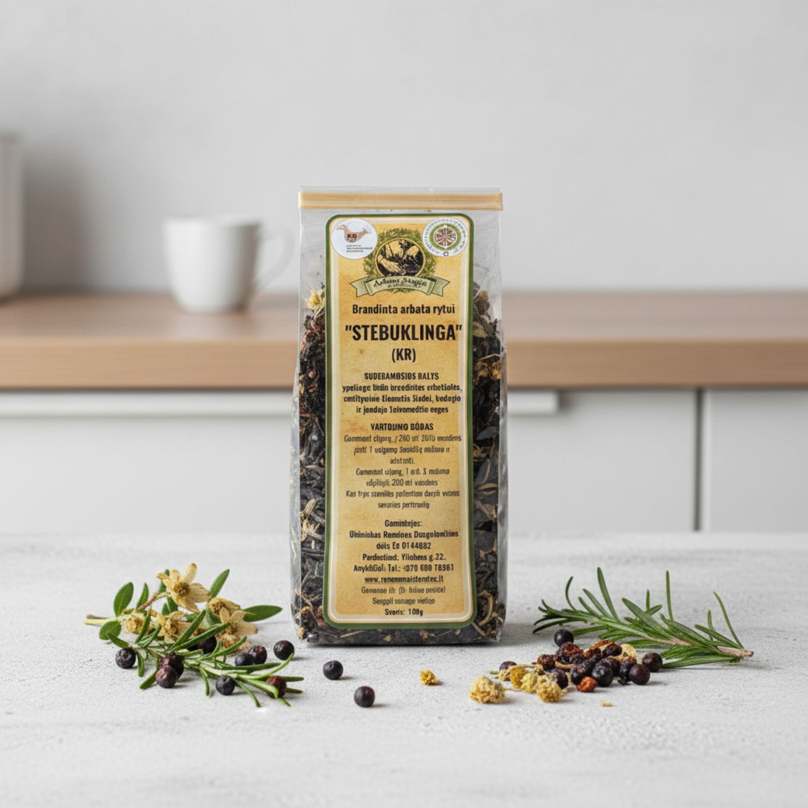| Sudėtis: | ypatingu būdu brandintos arbatžolės, smiltyninio šlamučio žiedai, kadagio ir juodojo šeivamedžio uogos. |