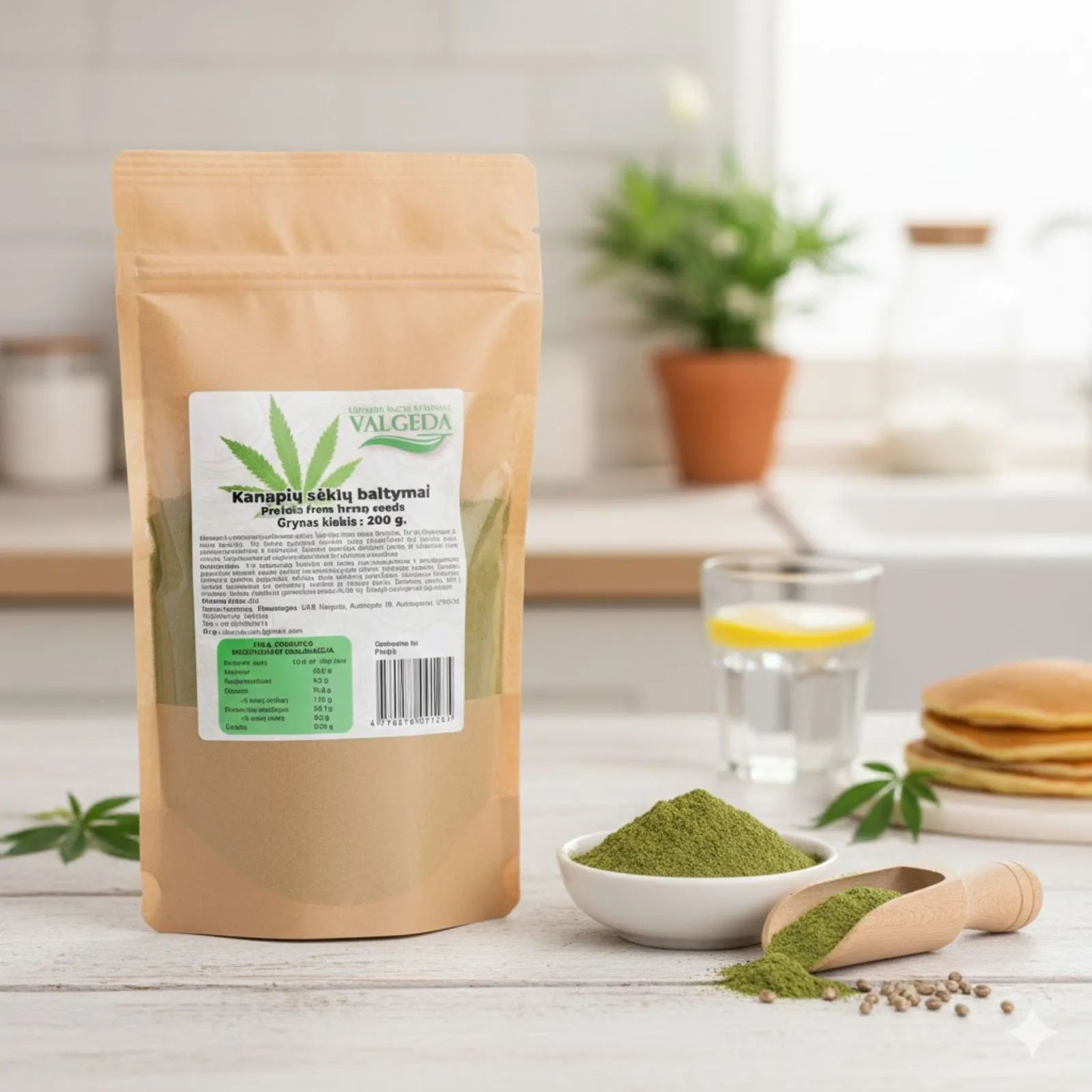 Kanapių sėklų baltymai „VALGEDA“, 200 g – 100 % natūralus augalinis baltymų šaltinis kasdieniam naudojimui. Puikiai tinka vegetarams, veganams, sportuojantiems ir visiems, norintiems sąmoningai papildyti mitybą augaliniais baltymais.