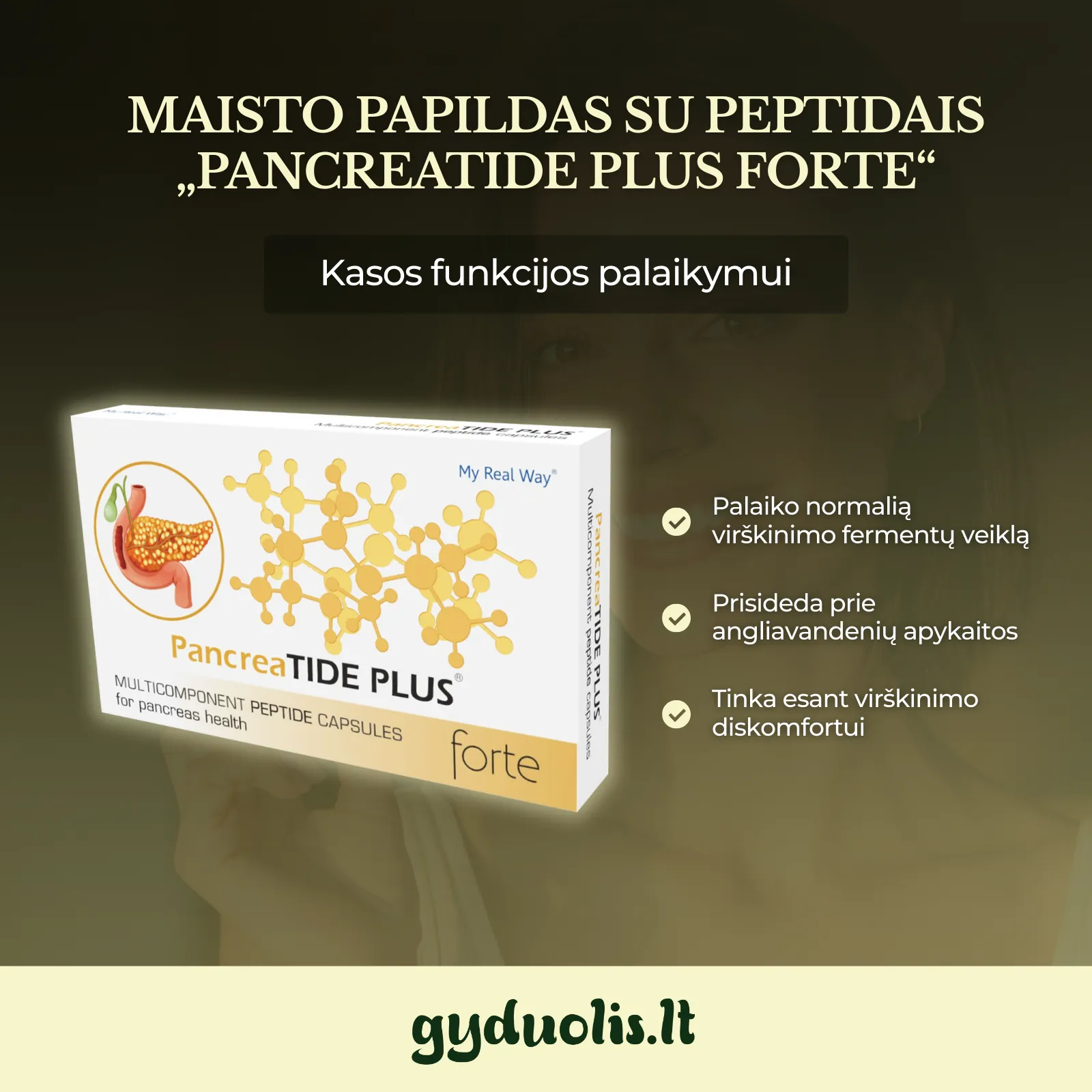Maisto papildas PancreaTIDE PLIUS Forte – tai natūralus daugiakomponentis peptidinis kompleksas, sukurtas palaikyti kasos funkcijas ir bendrą medžiagų apykaitos pusiausvyrą. Kasa yra itin svarbus organas, dalyvaujantis tiek virškinimo, tiek angliavandenių apykaitos procesuose. Ji gamina fermentus, reikalingus angliavandenių, baltymų ir riebalų skaidymui, taip pat hormonus, padedančius palaikyti normalų cukraus kiekį kraujyje.