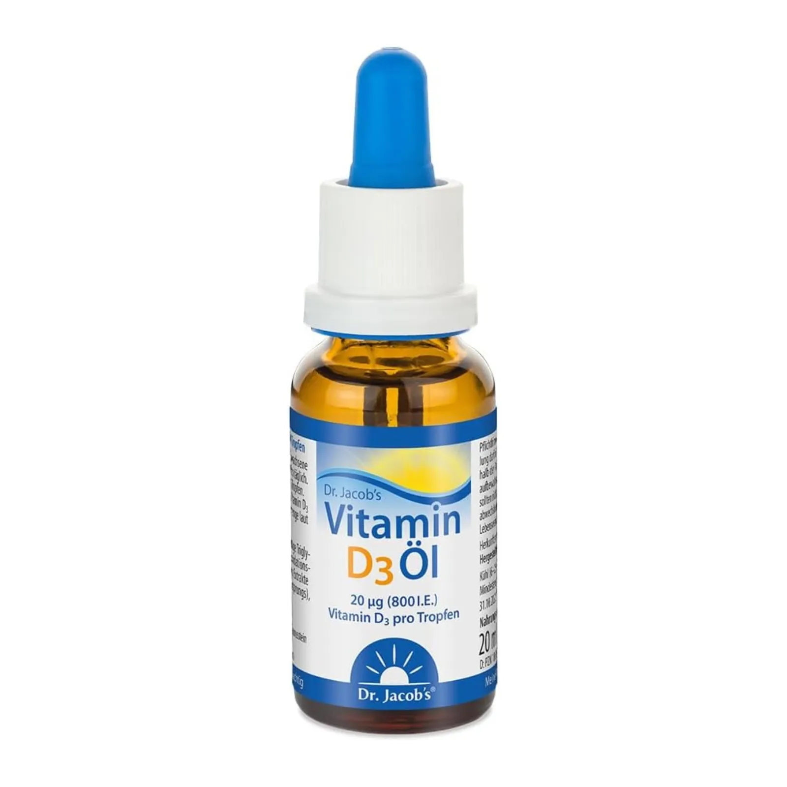 Vitaminas D3 „Vitamin D3 Öl“, skystis, DR. JACOBS – tai aliejinės formos vitaminas D3, skirtas kasdieniam vartojimui visai šeimai. Viename 20 ml buteliuke yra net 600 porcijų, todėl produktas pasižymi puikiu kainos ir kokybės santykiu. Tamsaus stiklo pakuotė su praktiška pipete leidžia tiksliai ir patogiai dozuoti.