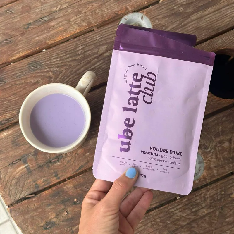 Purpurinio jamso (Ube) latte — tai natūralūs, 100 % gryni purple yam milteliai, garsėjantys išskirtinėmis antioksidacinėmis savybėmis, subtiliu vanilės–riešutų skoniu ir švelnia, aksomine tekstūra. Šis ingredientas populiarus visame pasaulyje dėl savo maistinių savybių ir įspūdingos spalvos, kintančios nuo rožinės iki purpurinės ar net mėlynos — priklausomai nuo naudojamo pieno pH.
