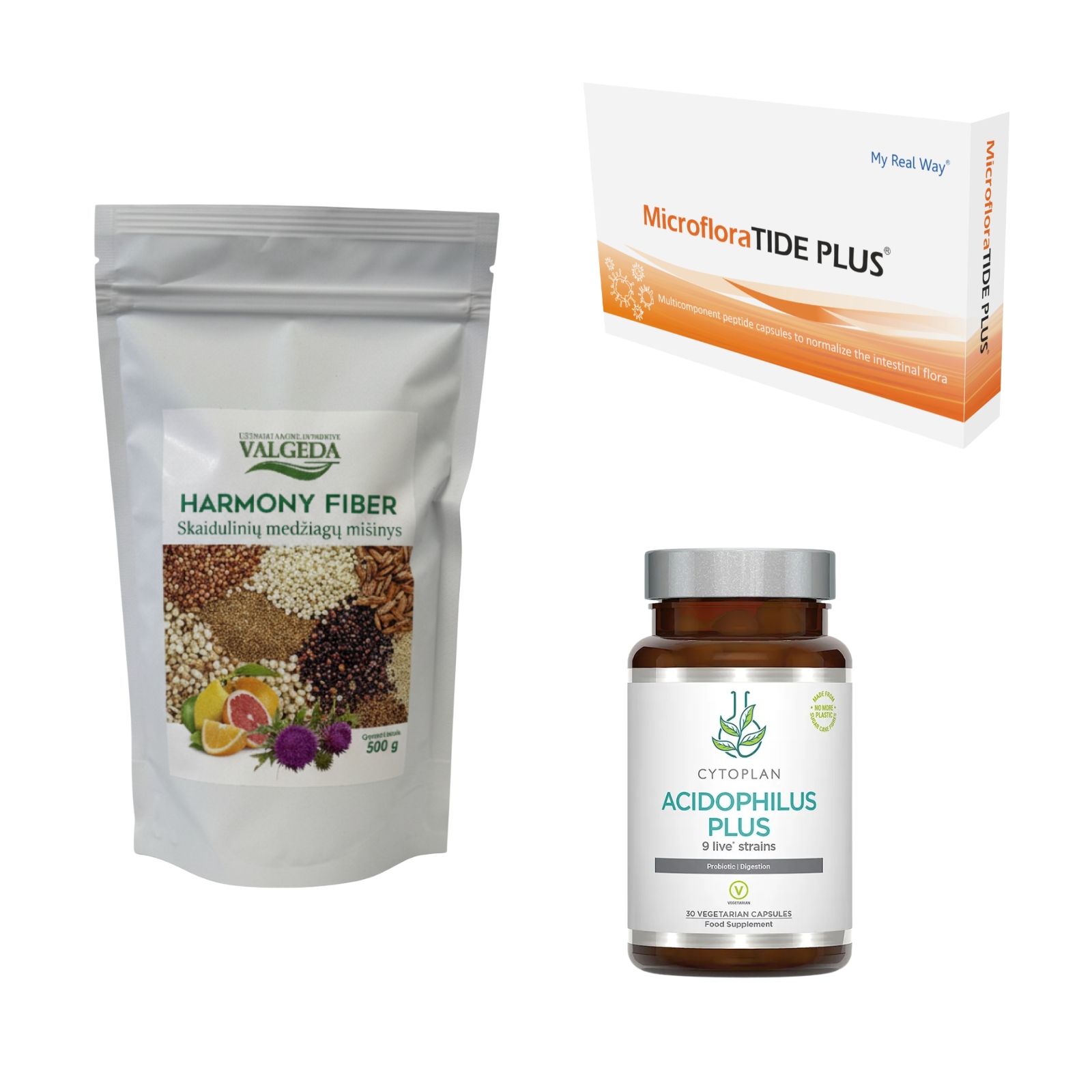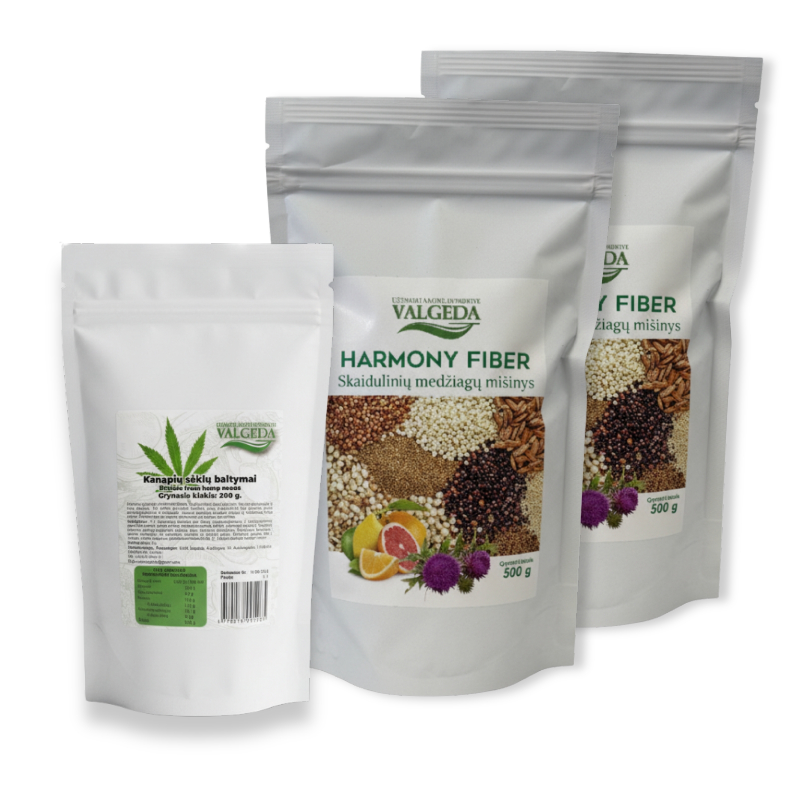 Skaidulų ir baltymų rinkinys HARMONY FIBER x 2 + Kanapių sėklų baltymai, 500 g x 2 + 200 g, VALGEDA